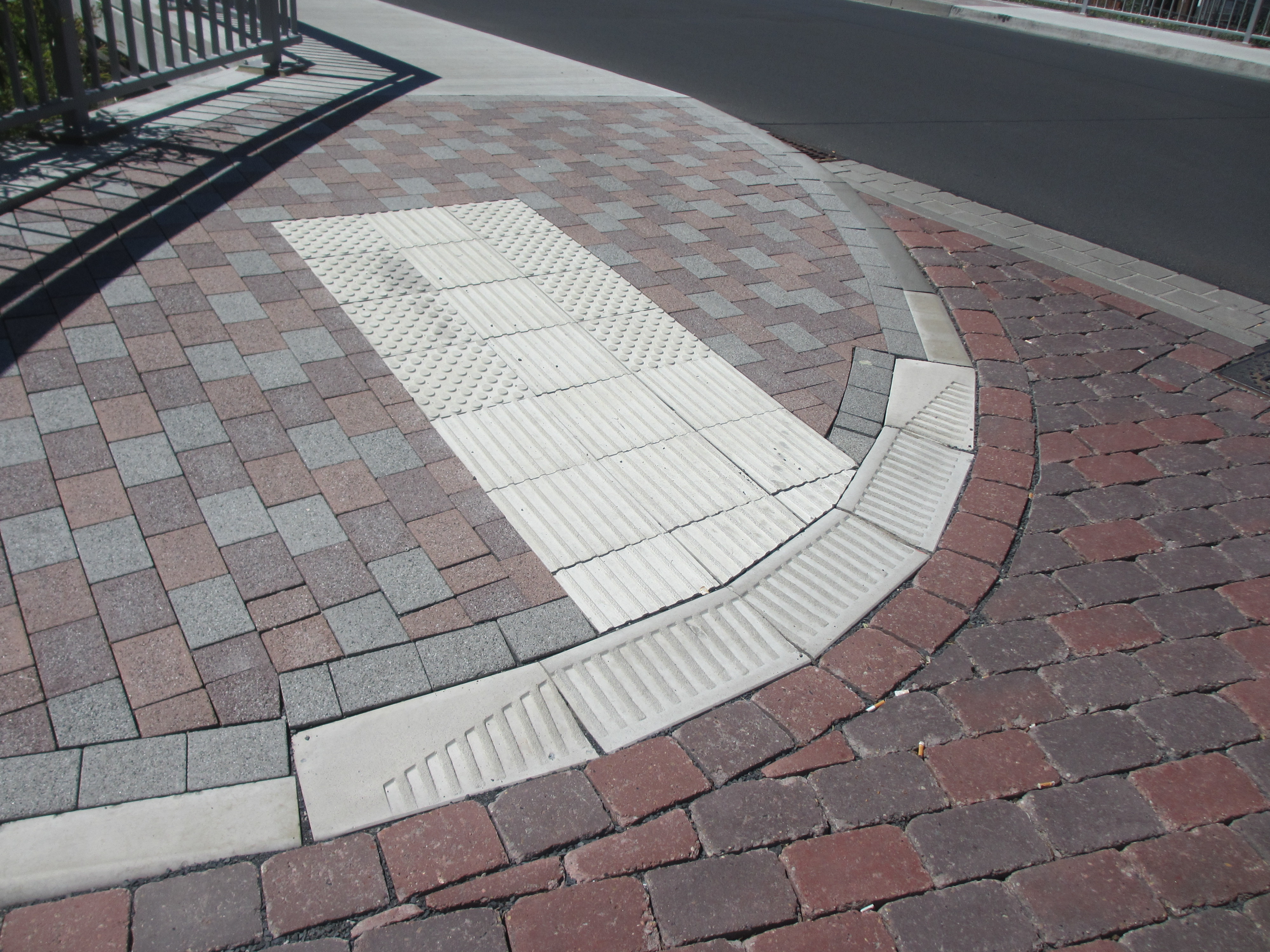 Das angrenzende taktile Leitsystem aus Rillen- und Noppenplatten wird je nach umgebenden Bodenbelag in einem leuchtenden weißen oder sehr dunklen anthrazit Farbton hergestellt.